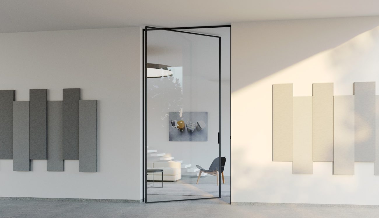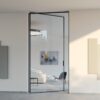 Πόρτα με λεπτό κάσσωμα αλουμινίου 40mm χωρίς περιμετρική κορνίζα. Το φύλλο ανοίγει και κλείνει με πλαϊνούς μεντεσέδες. Επιλογές κλειδαριών: μαγνητική, μηχανική, έκδοση για WC αλλά και αξεσουάρ συγκράτησης φύλλου “easyclick”.