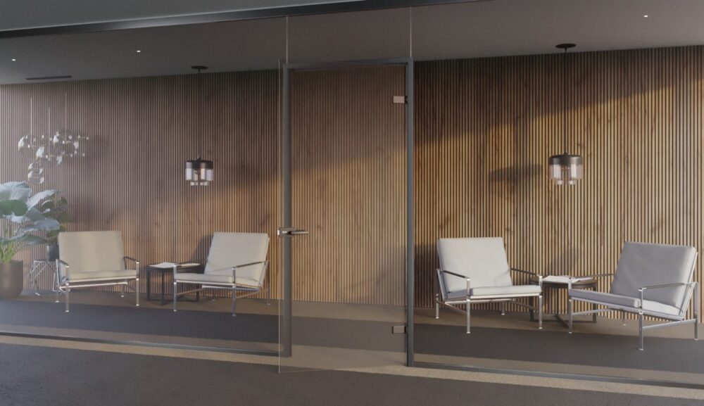 Εσωτερική πόρτα με στιβαρό κάσσωμα αλουμινίου σχήματος “U” το οποίο εφαρμόζει κυρίως σε γυάλινους τοίχους αλλά και σε τοίχους από άλλα υλικά, χωρίς περιμετρική κορνίζα.